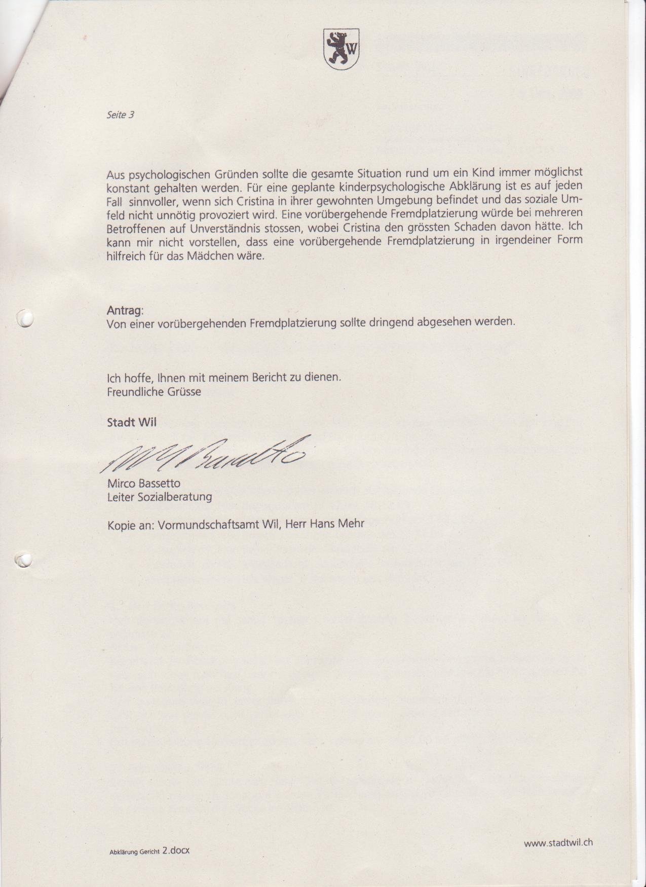 Wil, 13.06.10. Mi chiamo Bonagura Enrico . Sono Italiano . Nato il 01-10-1958 a Napoli . Da 12 anni mi batto contro gli abusi, i soprusi e le persecuzioni della Magistratura di San Gallo . Non sapendo più cosa fare per fermarmi , hanno praticamente sequestrato mia Figlia Cristina di 9 Anni, con calunnie e infamanti diffamazioni . Un continuo incitamento al Crimine, finalizzato a nascondere poi tutti i loro soprusi . Con la solita frase " LO SAPEVAMO CHE ERA PERICOLOSO " . Se guardate questo video capirete che mia Figlia è in perfette condizioni di salute e felice. Mi sono separato da mia moglie il 1. ottobre 2007 e da subito lei mi ha lasciato in affido la nostra figlia Cristina e la sua figlia Nikol avuta da un altro uomo, andando a vivere da sola. Da allora mia figlia Cristina ha vissuto sempre con me, fino al 3 giugno 2010, giorno in cui il Giudice Weiss, contro il parere dei servizi sociali. Infatti, come si può leggere dalla lettera che segue, i servizi sociali sono contrari ad un collocamento della mia bambina: