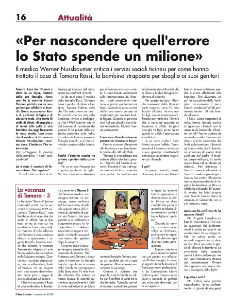 Tamara Rossi ha 13 anni e abita in un foyer, lontano dalla sua famiglia. Nove anni fa le autorità ticinesi l'hanno portata via ai suoi genitori per affidarla ai Bianchi. Questi accusavano i Rossi di picchiare la figlia e di educarla male. Una storia di soldi, di affetti, di orgoglio e di errori sulla pelle di una bambina che oggi frequenta la terza media. Una storia che il medico di Gravesano Werner Nussbaumer conosce bene. L'Inchiesta l'ha intervistato.