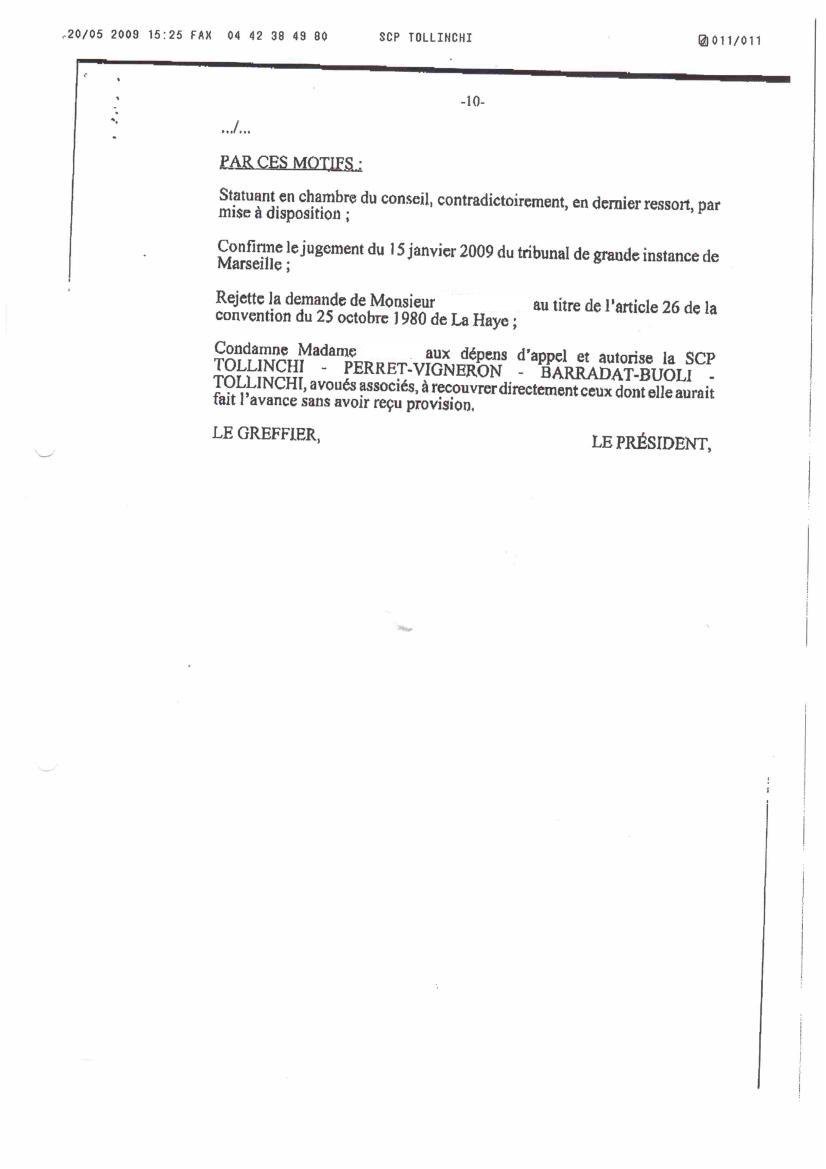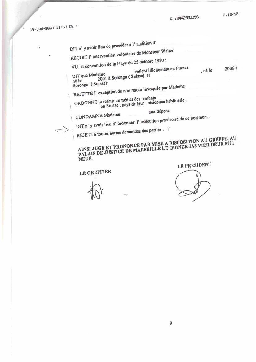 Le indagini hanno però dimostrato l'innocenza del padre e le false accuse di maltrattamenti fisici. La madre è stata dunque condannata al rimpatrio a Minusio, coi due figli allontanati dal padre illecitamente. Alleghiamo il dispositivo finale della decisione di prima istanza del 15.1.2009 in cui la madre viene condannata al rimpatrio immediato in quanto trattiene in modo illegittimo i 2 figli in Francia. Il secondo, è il dispositivo finale di seconda istanza della decisione del 20.5.2009 in cui viene confermata la prima decisione. Pertanto, la madre deve far ritorno in Ticino con i due bambini da lei trattenuti illegalmente in Francia, lontano dal padre.